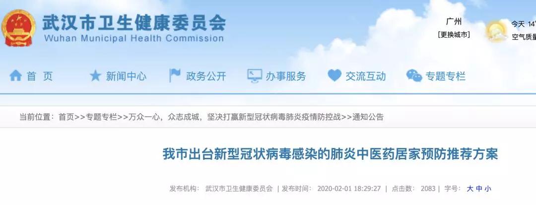 根据中医“治未病”理念,武汉市新型冠状病毒感染的肺炎中医药专家组研究制定了《武汉市新型冠状病毒感染的肺炎中医药居家预防推荐方案》,供广大群众参考。推荐方案包括药物预防、香薰疗法、适度运动三个方面,旨在通过增强人民体质,提升机体免疫力,有效防止疾病扩散流行。