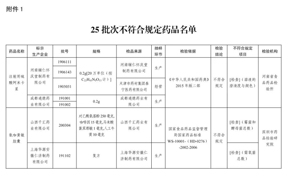 一、经河南省食品药品检验所检验,标示为河南辅仁怀庆堂制药有限公司、成都通德药业有限公司生产的5批次注射用硫酸阿米卡星不符合规定,不符合规定项目为溶液的澄清度与颜色。