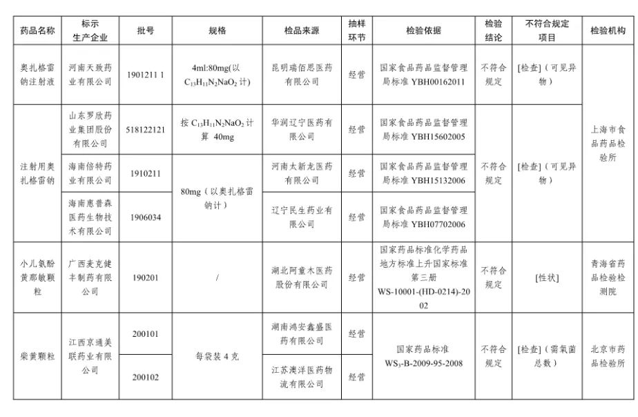 经上海市食品药品检验所检验,标示为河南天致药业有限公司生产的1批次奥扎格雷钠注射液不符合规定,不符合规定项目为可见异物;标示为山东罗欣药业集团股份有限公司、海南倍特药业有限公司、海南惠普森医药生物技术有限公司生产的3批次注射用奥扎格雷钠不符合规定,不符合规定项目为可见异物。
