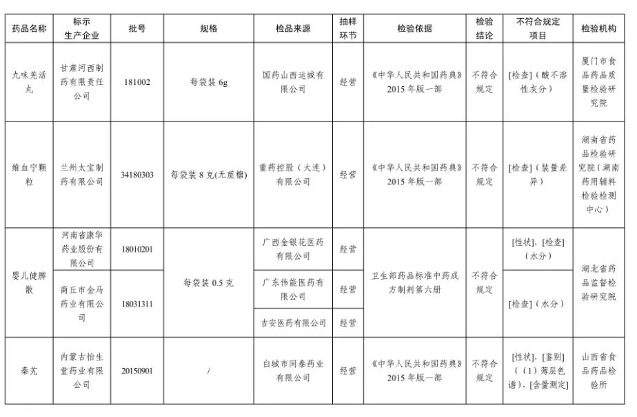 经湖北省药品监督检验研究院检验,标示为河南省康华药业股份有限公司、商丘市金马药业有限公司生产的2批次婴儿健脾散不符合规定,不符合规定项目包括性状、水分。
